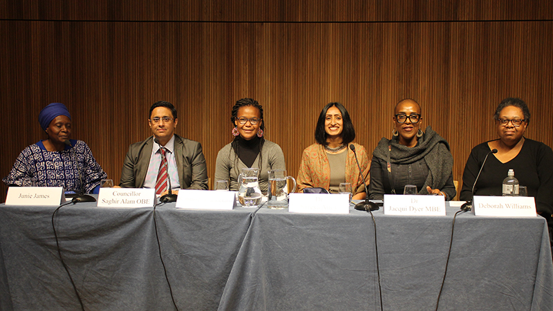Panel Discussants (Left to Right): Junie James, Councillor Saghir Alam OBE, Nomfundo Ramalekana (Chair), Dr Shreya Atrey, Dr Jacqui Dyer MBE, and Deborah Williams (Executive Director of the Creative Diversity Network). ©Emilia Cieslak